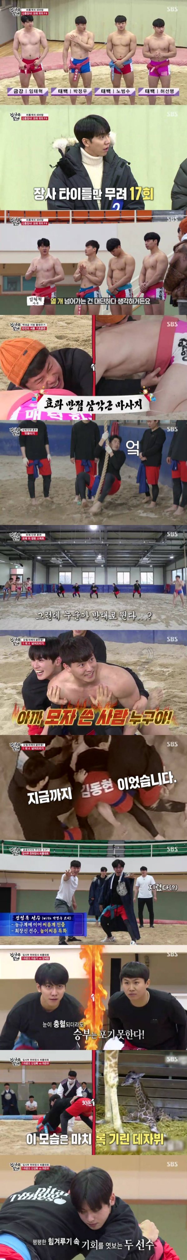 그런가 하면 허선행은 선배 임태혁에 대해 “씨름판에서 연예인이다. 장사들의 장사”라며 팬심을 드러냈다. 장사 타이틀 17회에 빛나는 임태혁은 “장사 타이틀 하나도 쉽지 않은데 열 개 넘어가는 건 대단하다 생각한다. 그걸 17번 했으니까”라며 셀프 칭찬을 해 웃음을 자아냈다. 그런 그는 현역 중에서 장사 타이틀을 가장 많이 가지고 있다고.