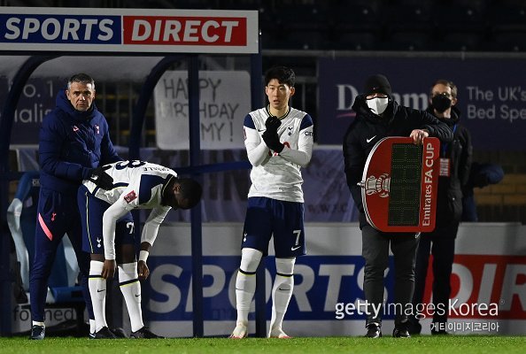 손흥민(29·토트넘)이 26일(이하 한국시간) 영국 하이 위컴의 애덤스 파크에서 열린 2020-2021시즌 FA컵 4라운드(32강) 위컴 과의 경기에서 후반 28분 출전 대기하고 있다.