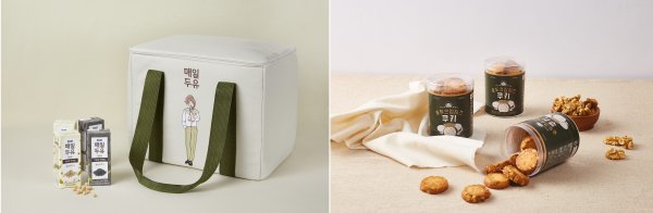 매일두유x알비백 기획 패키지(왼쪽), 밀가루와 설탕 없이 만든 무화당 호두크림쿠키. 사진제공|매일유업