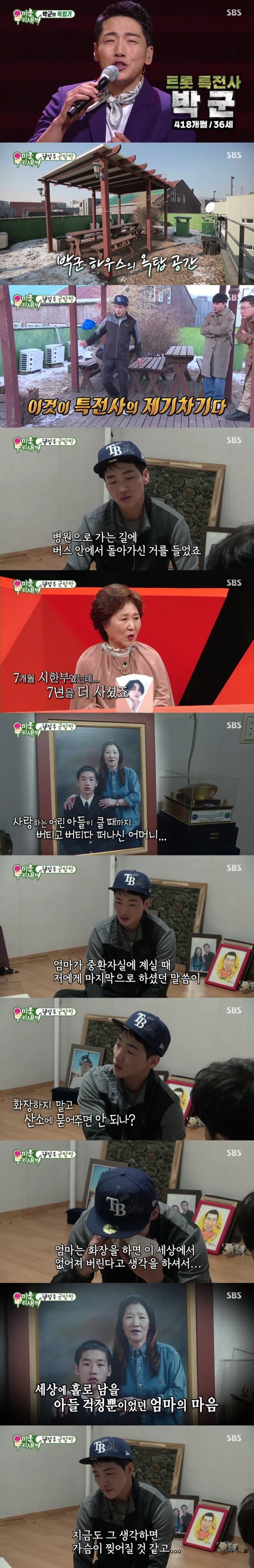 식사를 마친 이상민은 4살 때 아버지가 돌아가신 후 어머님이 혼자 민속 주점을 하며 힘들게 자신을 키운 사연을 털어놓으며, 홀로 남은 박군의 사정을 안타까워했다. 이에 박군은 "어머니가 2007년 내가 22살 때 돌아가셨다. 군대 3년 차였다. 훈련하는데 위급하다고 연락이 와서 지휘관께 보고 드리고 병원으로 갔다. 하지만 병원으로 가는 길에 버스 안에서 어머니가 돌아가셨다는 소식을 들었다. 임종을 지키지 못했다"라고 어머님이 떠나던 날을 떠올렸다.