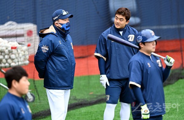 1일 창원 마산야구장에서 프로야구 NC 다이노스의 2021 스프링캠프가 열렸다. 캠프 첫날 비가 그친 후 이동욱 감독이 선수들과 이야기를 나누고 있다.