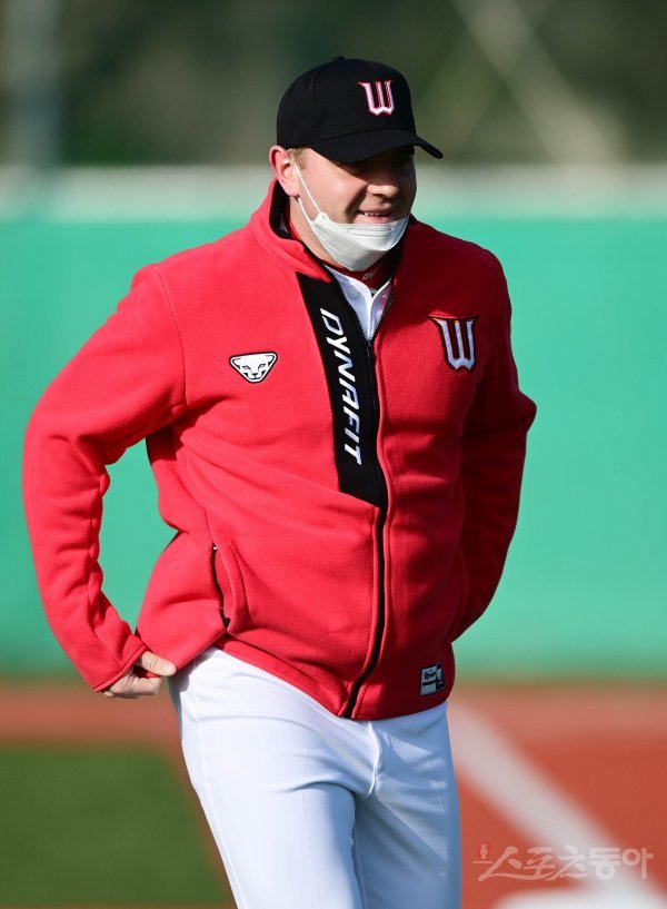 2일 제주 강창학야구장에서 SK 와이번스의 전지훈련이 열렸다. SK 르위키가 훈련 중 웃고 있다.