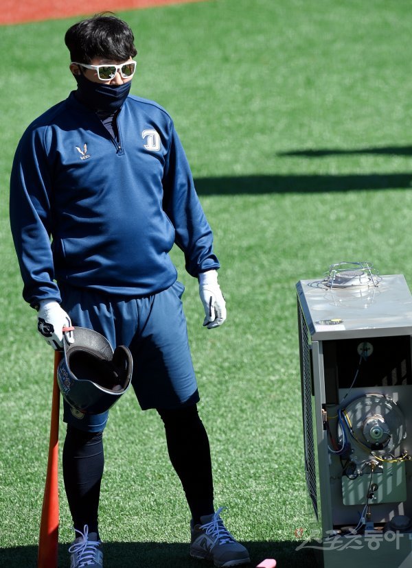 2일 창원 마산야구장에서 프로야구 NC 다이노스의 2021 스프링캠프가 열렸다. 쌀쌀한 날씨속에 NC 양의지가 배팅훈련도중 난로 앞에서 휴식을 취하고 있다.