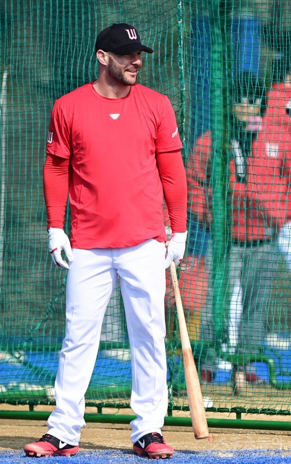 SK 로맥이 타격 훈련 중 웃고 있다.