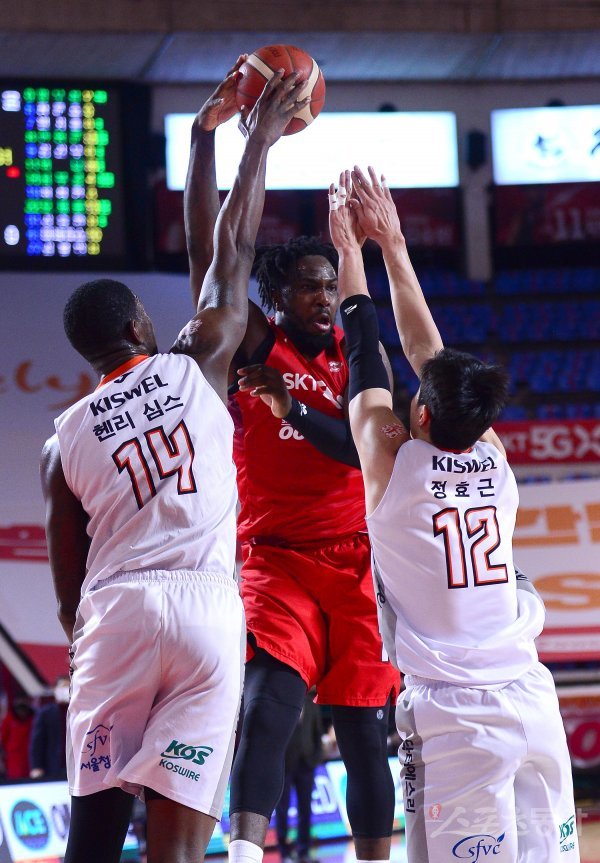 2일 잠실학생체육관에서 열린 ‘2020-2021 현대모비스 프로농구’ 서울 SK와 인천 전자랜드 경기에서 SK 워니의 패스가 전자랜드 심스의 손에 걸리고 있다.