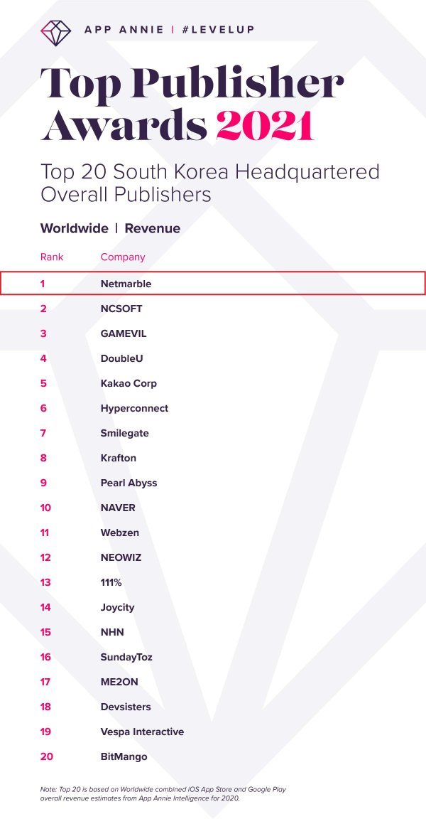 모바일 앱 마켓 분석 사이트 앱애니가 1월 27일 발표한 자료에 따르면, 넷마블은 지난해 앱스토어와 구글 플레이 합산 부문 매출에서 텐센트, 넷이즈, 액티비전 블리자드 등과 함께 TOP 10에 진입했다. 또 한국 퍼블리셔 중 글로벌 매출 1위를 기록했다.