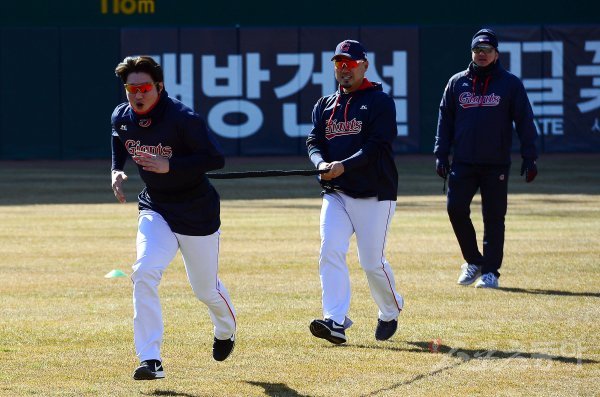 3일 부산 사직야구장에서 프로야구 롯데 자이언츠의 2021 스프링캠프가 열렸다. 쌀쌀한 날씨속에 롯데 김대우와 송승준이 훈련을 펼치고 있다.