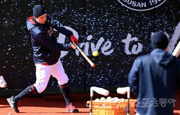 3일 부산 사직야구장에서 프로야구 롯데 자이언츠의 2021 스프링캠프가 열렸다. 쌀쌀한 날씨속에 롯데 전준우가 타격 훈련을 하고 있다.