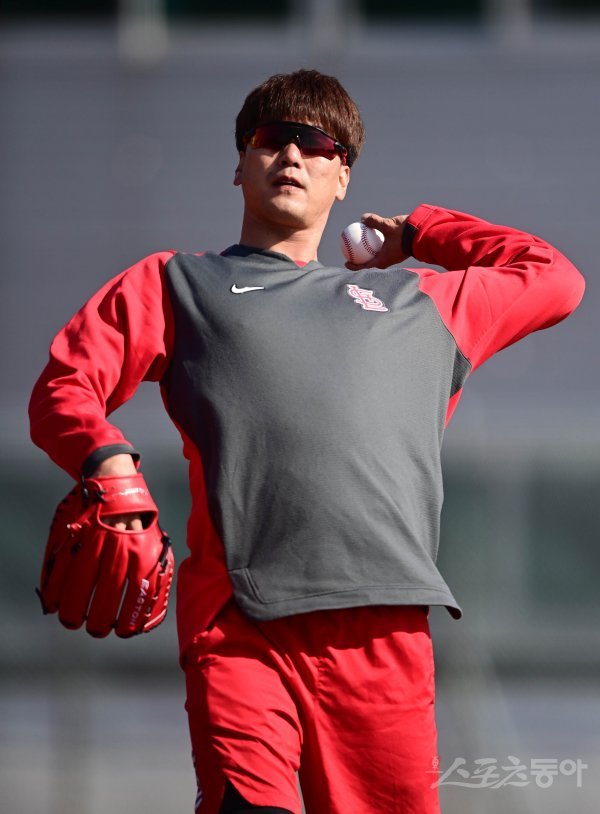 세인트루이스 김광현이 3일 제주 강창학야구장에서 열린 SK 와이번스 전지훈련장을 방문해 캐치볼을 하고 있다.