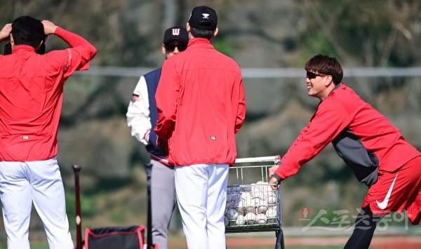 세인트루이스 김광현이 3일 제주 강창학야구장에서 열린 SK 와이번스 전지훈련장을 방문해 SK 선수들과 이야기를 하고 있다.