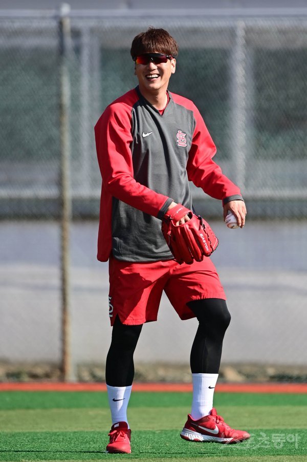 세인트루이스 김광현이 3일 제주 강창학야구장에서 열린 SK 와이번스 전지훈련장을 방문해 캐치볼을 하고 있다.