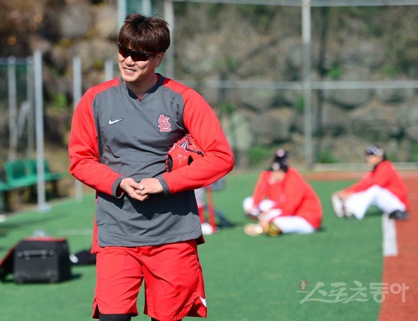 세인트루이스 김광현이 3일 제주 강창학야구장에서 열린 SK 와이번스 전지훈련장을 방문해 캐치볼을 마친 후 취재진을 향해 인사하고 있다.