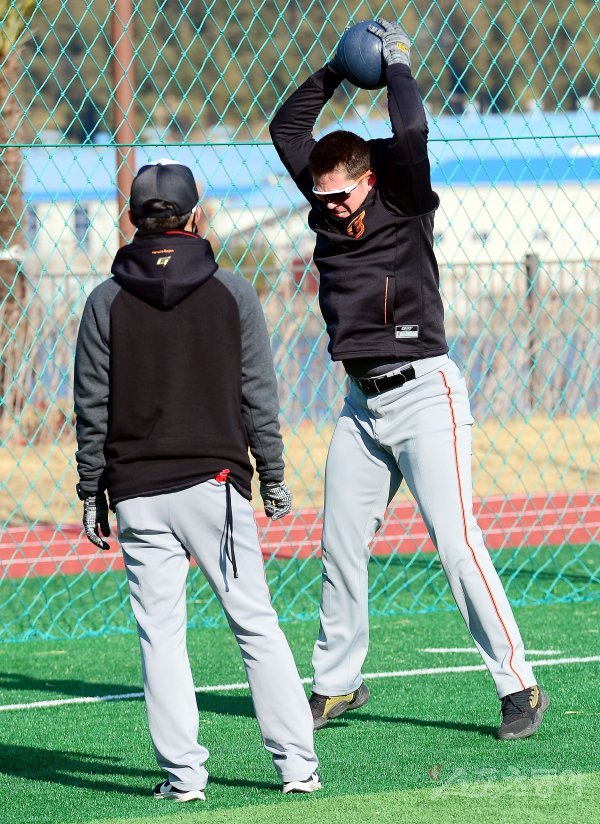 4일 경남 거제 하청스포츠타운에서 프로야구 한화 이글스의 2021 스프링캠프가 열렸다. 한화 힐리가 스트레칭 훈련을 하고 있다.