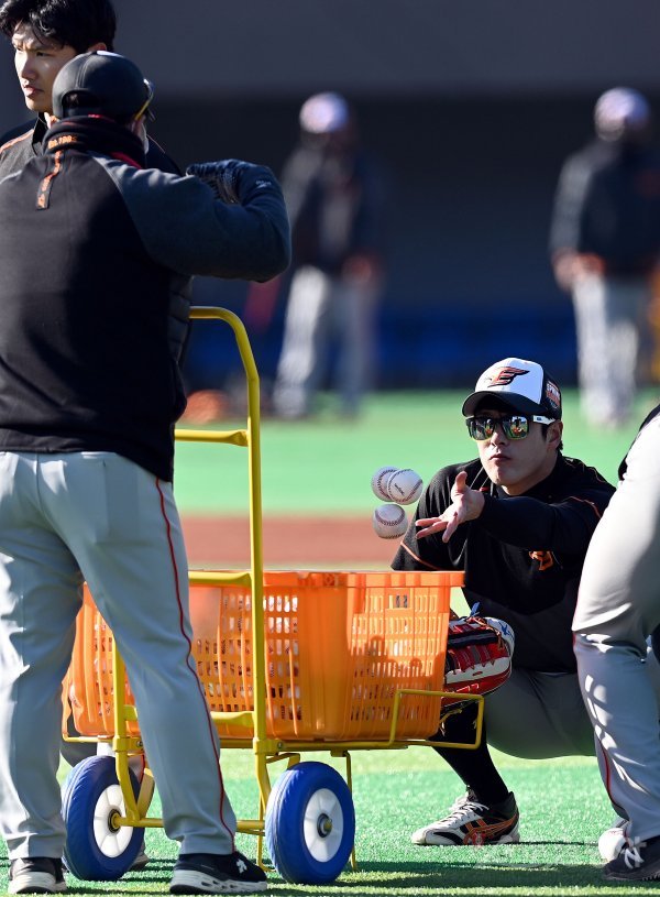 4일 경남 거제 하청스포츠타운에서 프로야구 한화 이글스의 2021 스프링캠프가 열렸다. 한화 노수광이 훈련을 마치고 볼을 줍고 있다.