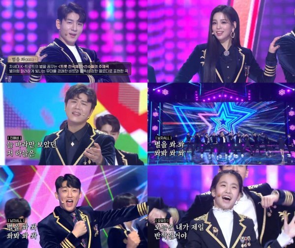 ‘별을 쏴’ 무대는 한강과 신미래의 내레이션으로 시작되며 TOP14인 한강과 신미래 그리고 진해성, 신승태, 김용빈, 김윤길, 민수현, 박예슬, 반가희, 오유진, 상호&상민, 재하, 정주형, 최향의 개성 가득한 퍼포먼스와 다채로운 표정이 돋보이고 있다.