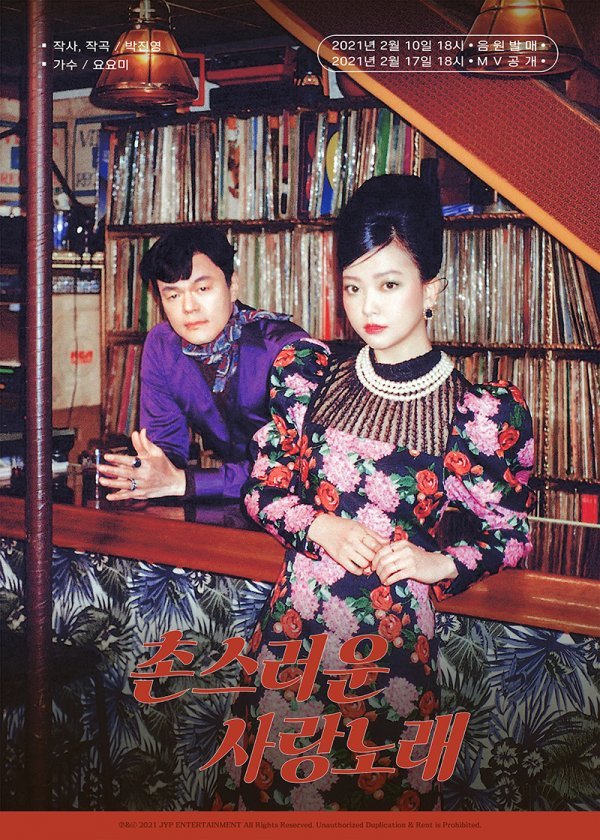 JYP엔터테인먼트(이하 JYP)는 10일 '촌스러운 사랑노래' 발매를 앞두고, 5일 오전 SNS 채널을 통해 제작자 박진영과 가수 요요미의 모습이 담긴 티저 사진을 공개했다. 박진영과 요요미는 아늑하고 포근한 옛날 라이브 음악 카페에서 레트로 매력을 뽐냈고, 그때 그 시절에 있었을 법한 추억의 인물들로 완벽 변신했다. 촌스럽지만 정겹고 따스한 분위기가 '촌스러운 사랑노래' 완곡에 대한 호기심을 불러일으킨다.