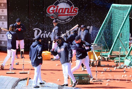 3일 부산 사직야구장에서 프로야구 롯데 자이언츠의 2021 스프링캠프가 열렸다. 쌀쌀한 날씨속에 롯데 선수들이 타격훈련을 펼치고 있다. 사직 | 김민성 기자 marineboy@donga.com