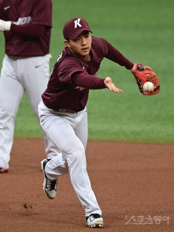 7일 서울 고척스카이돔에서 열린 키움 히어로즈의 2021 스프링캠프에서 김휘집이 수비 훈련을 하고 있다.