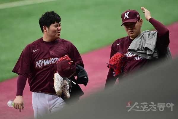7일 서울 고척스카이돔에서 열린 키움 히어로즈의 2021 스프링캠프에서 한현희와 양현이 훈련을 마친 뒤 더그아웃으로 향하고 있다.