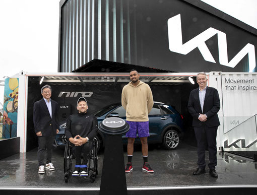 기아는 7일 호주 빅토리아 주 멜버른 파크에서 ‘2021 호주오픈 대회’ 공식 차량 전달식과 신규 로고 공개 이벤트를 가졌다. 조준수 기아 호주판매법인장, 딜런 알콧, 휠체어 테니스 선수, 닉 키리오스 테니스 선수, 크레이그 타일리 호주오픈 토너먼트 디렉터(왼쪽부터)가 ‘2021 호주오픈 공식차량 전달식’에 참석하고 있는 모습. 사진제공|기아