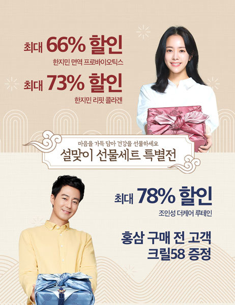 오는 10일까지 ‘PLAN.100(플랜백)’ 프로바이오틱스와 ‘더케어 루테인’ 라인 제품을 비롯해 ‘진한 6년근 홍삼 스틱’, ‘Refit(리핏)’ 콜라겐 등을 최대 78% 할인 판매한다. 프로모션 제품을 구매하는 모든 고객에게는 선물용 쇼핑백과 마스크 1박스(50매)를, 10만 원 이상 구매하는 고객에게는 선착순으로 프라이팬을 증정한다.