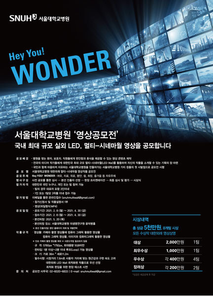 서울대병원은 국내 최대 규모의 실외 LED인 ‘대한외래 멀티-시네마월’에 게시할 영상작품 공모전을 개최한다.