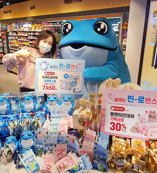 7일 편의점 이마트24 성수대우점에서 모델과 두꺼비 캐릭터가 밸런타인데이 기획 상품을 소개하고 있다. 이마트24는 하이트진로와 손잡고 두꺼비 캐릭터를 내세운 ‘저금통 세트’를 내놓았다. 파란 두꺼비 모양 저금통에 초콜릿을 담았다.