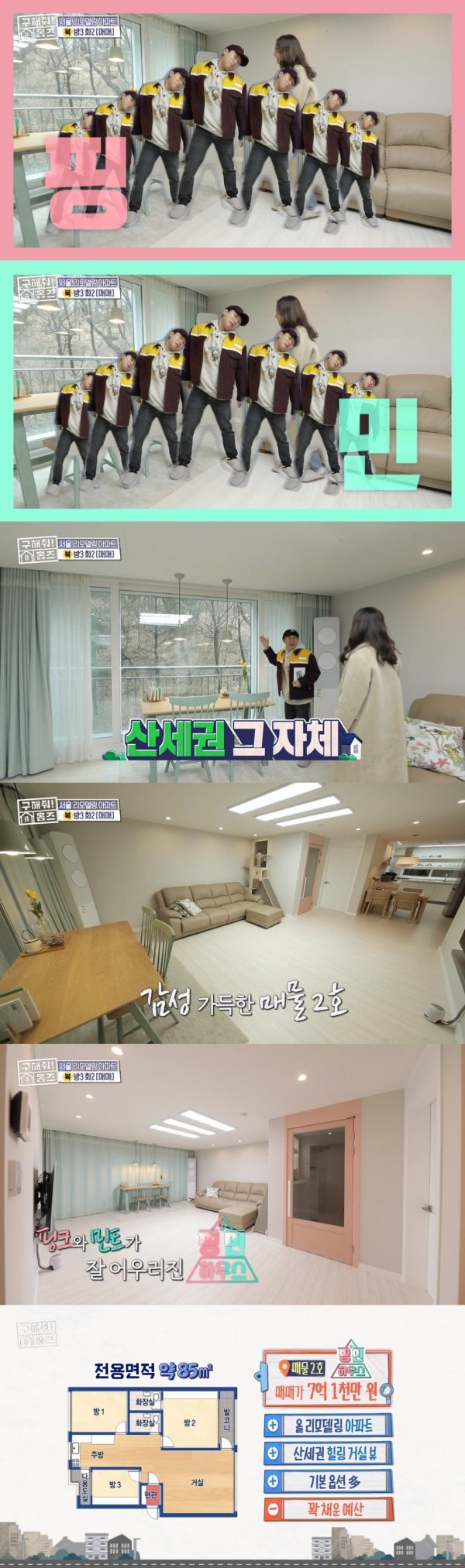 복팀의 두 번째 매물은 강북구 번동에 위치한 ‘핑민 하우스’였다. 매물 인근에 오패산 둘레길과 북서울 꿈의 숲이 있는 산세권 매물로 전체 리모델링을 마친 상태였다. 실내 인테리어를 핑크와 민트로 포인트를 줘 화사하게 느껴졌으며, 거실 통창 가득 숲이 보여 사계절을 감상할 수 있었다. 냉장고, 에어컨, 세탁기와 각종 가구들이 기본 옵션으로 주어져 시선을 사로잡았다.