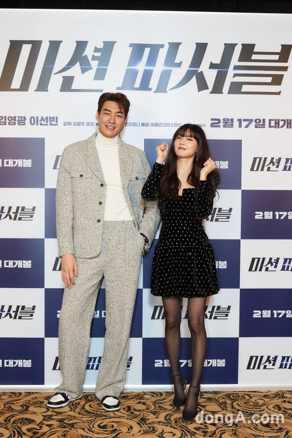배우 김영광(왼쪽)과 이선빈이 8일 오후 온라인으로 진행된 영화 \'미션 파서블\' 시사회에 참석해 포즈를 취하고 있다.