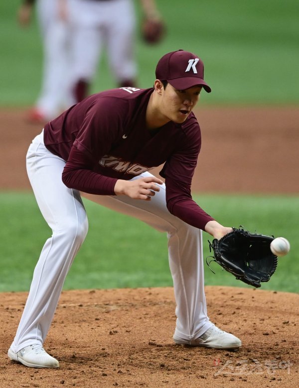 8일 서울 고척스카이돔에서 열린 키움 히어로즈의 2021 스프링캠프에서 안우진이 수비 훈련을 하고 있다.