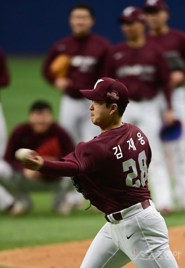 8일 서울 고척스카이돔에서 열린 키움 히어로즈의 2021 스프링캠프에서 김재웅이 수비 훈련을 하고 있다.