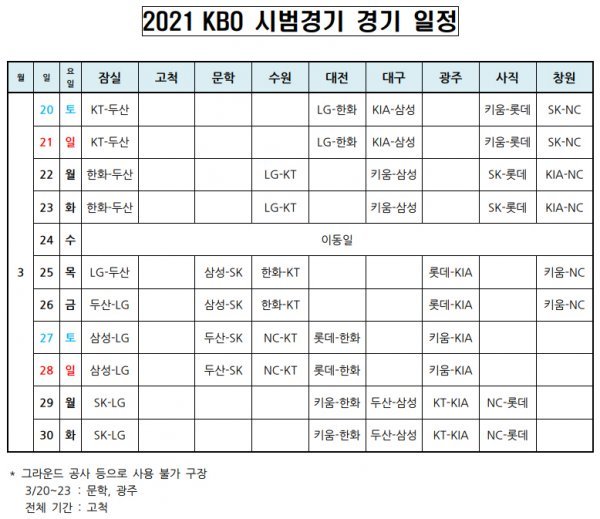 KBO가 9일 2021 KBO리그 시범경기 일정을 확정, 발표했다.