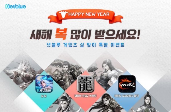 넷블루게임즈는 설 명절을 맞아 자사가 서비스하는 모바일 게임 ‘미르의 전설2 어게인’, ‘청량’, ‘레전드 오브 미르2 블랙’ 등 3종에서 설날 이벤트를 실시한다고 9일 밝혔다.