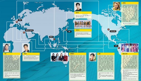 2020년은 그룹 방탄소년단·블랙핑크·트와이스 등 케이팝 스타들과 ‘사랑의 불시착’과 ‘기생충’ 등 한국 드라마와 영화가 전 세계 대중의 눈과 귀를 사로잡은 해로 기록된다. 실제로 지난해 전 세계 한류 팬이 사상 처음 1억명을 넘어섰다. 그만큼 한국 대중문화 콘텐츠는 막강한 영향력을 발휘하며 지구촌의 뚜렷한 흐름이자 중요한 콘텐츠로 자리 잡았음을 보여준다.그 대표적인 주역들의 성과와 활약상을 세계지도로 구성한다. 문화체육관광부와 한국국제교류재단이 최근 각각 내놓은 ‘2021 해외 한류 실태 조사’와 ‘2020 지구촌 한류 현황’ 보고서를 토대 삼았다.