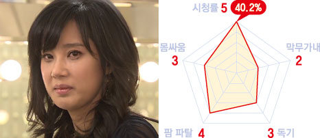 최고의 ‘쌈닭’ 캐릭터답게 상대방이 누구든 머리채부터 잡고 본다. 우렁찬 사자후도 빼놓을 수 없다. 광기 어린 연기를 펼치며 싸우는 장면이 하도 많아 촬영 내내 온몸이 멍투성이었을 정도다. 열정을 불살라 ‘국민악녀’에 등극, 그 해 연기대상을 차지했다.