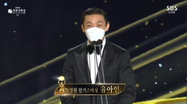 이날 청정원 인기스타상 수상자로는 유아인, 정유미가 선정됐다. 두 사람은 가까운 거리로 인해 마스크를 쓴 채 수상 소감을 밝혔다.