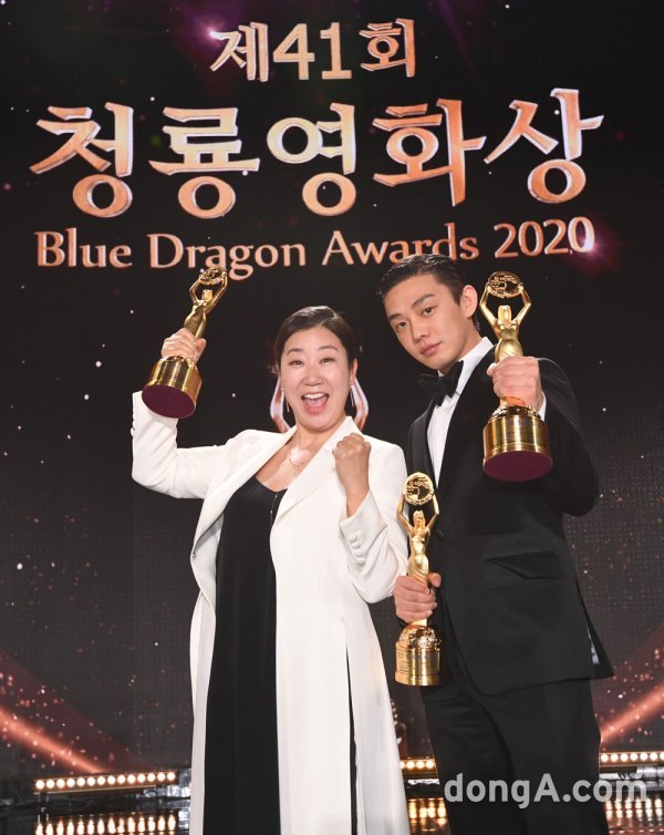배우 라미란(왼쪽)와 유아인이 9일 오후 인천 영종도 파라다이스시티에서 열린 제41회 청룡영화상 시상식에 참석하고 있다.