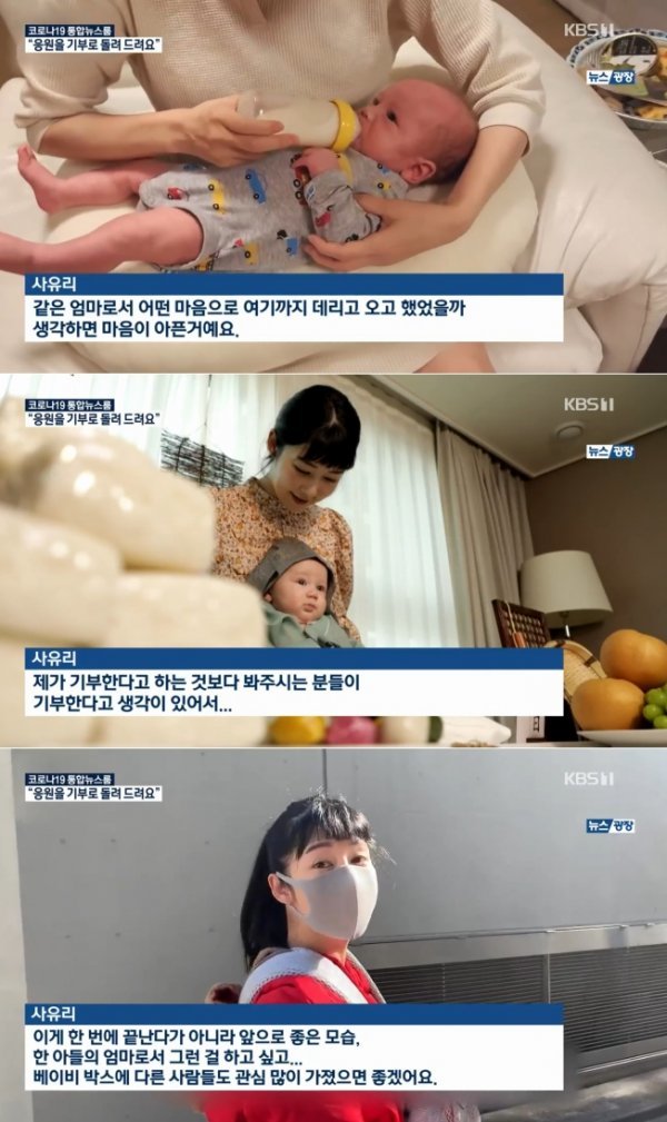기부와 관련해 사유리는 KBS에 “같은 엄마로서 어떤 마음으로 여기까지 데리고 왔을까 생각하니 마음이 아프더라. 내가 기부하는 것이 아니라 (영상을) 봐주는 분들이 기부한다는 생각으로 했다”며 “한 번에 끝나는 게 아니라 한 아들이 엄마로서 선행을 (꾸준히) 하고 싶다. 베이비박스에 다른 사람들도 관심을 많이 가졌으면 좋겠다”고 말했다.