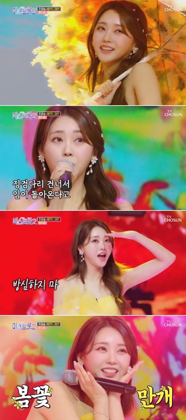 '미스트롯2' 홍지윤이 봄 아가씨로 변신해 '꽃바람'을 솔솔 불었다.