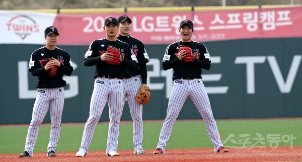 14일 경기도 이천 LG챔피언스파크에서 프로야구 LG 트윈스의 2021 스프링캠프가 열렸다. LG 오지환(오른쪽)이 훈련도중 함성을 지르고 있다.