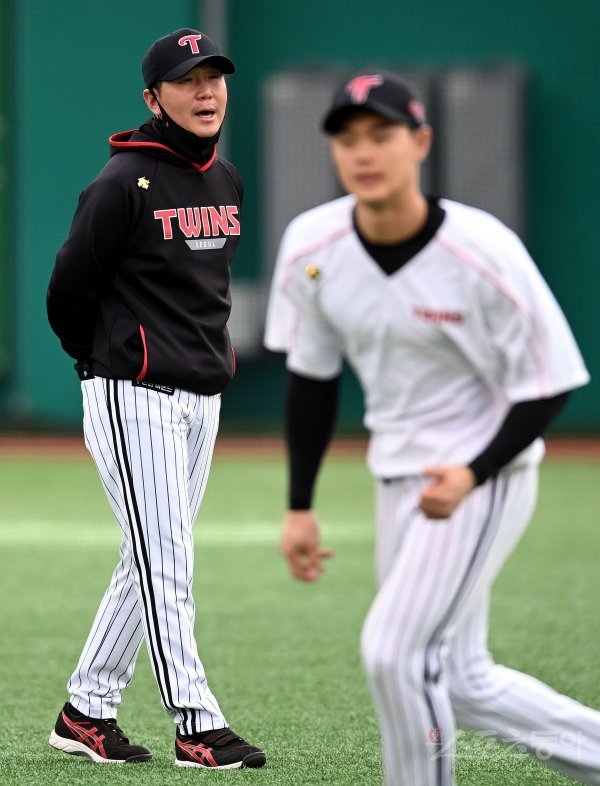 14일 경기도 이천 LG챔피언스파크에서 프로야구 LG 트윈스의 2021 스프링캠프가 열렸다. LG 류지현 감독이 선수들의 훈련을 바라보고 있다.