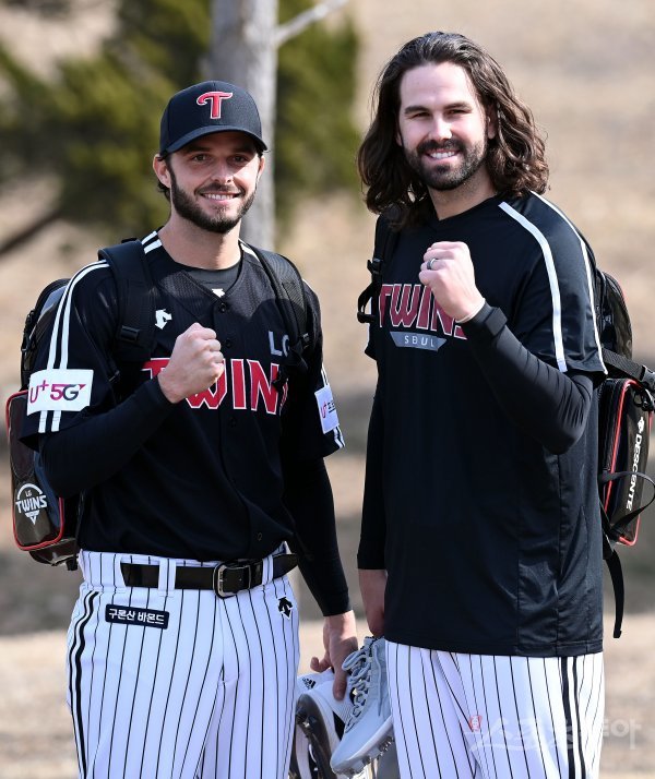 14일 경기도 이천 LG챔피언스파크에서 프로야구 LG 트윈스의 2021 스프링캠프가 열렸다. LG 새 외국인 투수 수아레즈와 켈리가 카메라를 향해 포즈를 취하고 있다.