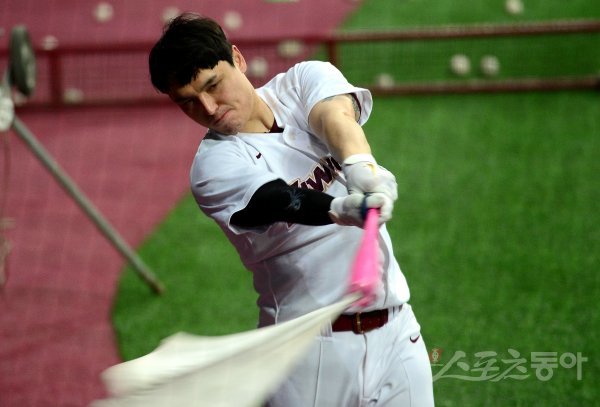 14일 서울 고척스카이돔에서 프로야구 키움 히어로즈의 2021 스프링캠프가 열렸다. 키움 박동원이 깃발이 달린 핑크색 배트로 스윙하고 있다.