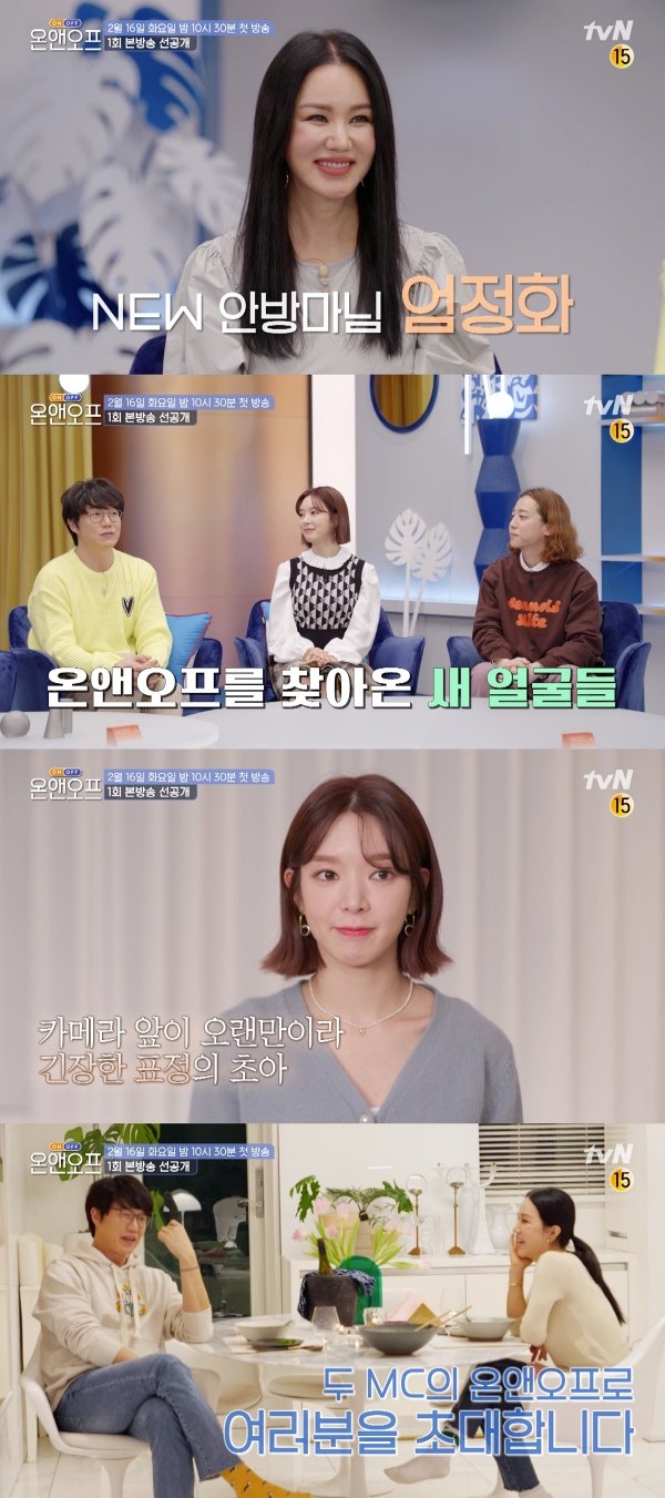 \'온앤오프\'는 바쁜 일상 속 사회적 나(ON)와 개인적 나(OFF)를 새로운 시선으로 담아내는 ‘사적 다큐’ 예능이다. 평소 쉽게 볼 수 없었던 스타들의 진솔하고 평범한 일상과 속마음을 공개하며 많은 사랑을 받았다. 새 단장을 끝낸 \'온앤오프\'는 엄정화와 성시경이 진행을 맡고 초아, 윤박, 넉살이 출연을 확정했다.