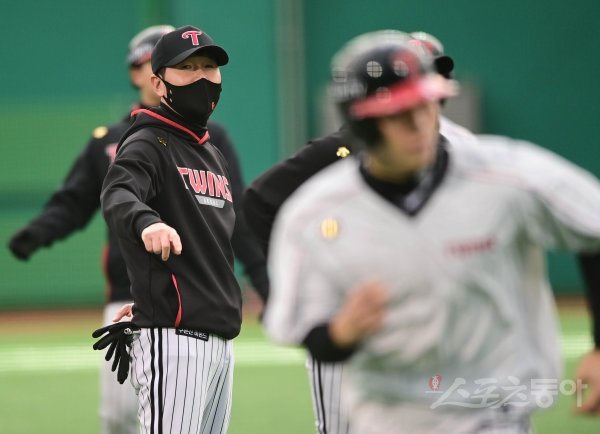 21일 경기도 이천 LG챔피언스파크에서 열린 LG 트윈스의 2021 스프링캠프에서 류지현 감독이 선수들에게 주루 훈련을 지도하고 있다. 이천 | 주현희 기자 teth1147@donga.com