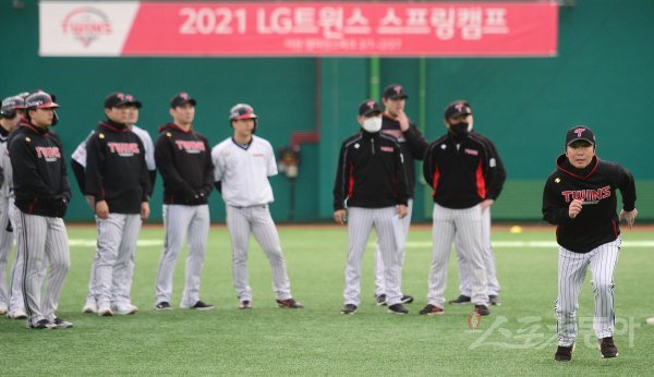 21일 경기도 이천 LG챔피언스파크에서 열린 LG 트윈스의 2021 스프링캠프에서 류지현 감독이 선수들에게 주루 시범을 보이고 있다.