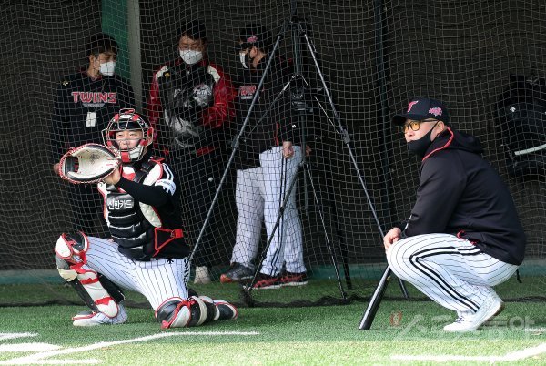 22일 경기도 이천 LG챔피언스파크에서 프로야구 LG 트윈스의 2021 스프링캠프가 열렸다. LG 조인성 코치가 김재성을 바라보고 있다.