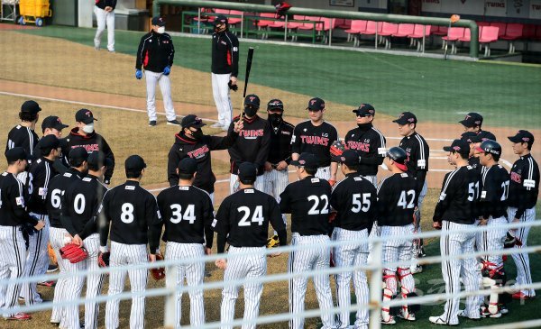 22일 경기도 이천 LG챔피언스파크에서 프로야구 LG 트윈스의 2021 스프링캠프가 열렸다. LG 김민호 코치(가운데)가 훈련에 앞서 선수들에게 훈련 내용을 전달하고 있다.