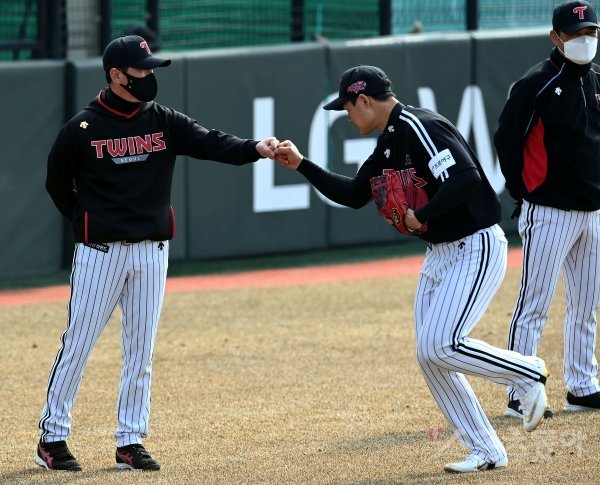 22일 경기도 이천 LG챔피언스파크에서 프로야구 LG 트윈스의 2021 스프링캠프가 열렸다. LG 류지현 감독이 훈련을 마친 이영빈과 하이파이브를 나누고 있다.