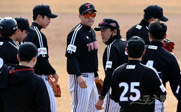22일 경기도 이천 LG챔피언스파크에서 프로야구 LG 트윈스의 2021 스프링캠프가 열렸다. LG 김민호 코치가 선수들과 이야기를 나누고 있다.